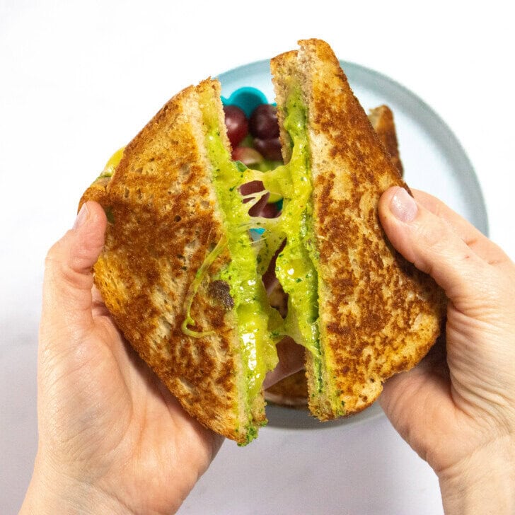 This grilled cheese is a hit with everyone. My kids love it with a side of grapes or strawberries, and I usually eat mine piping hot over the counter while juggling dishes, helping with middle school math, and lunch prep for the next day — you know, classic mom life.